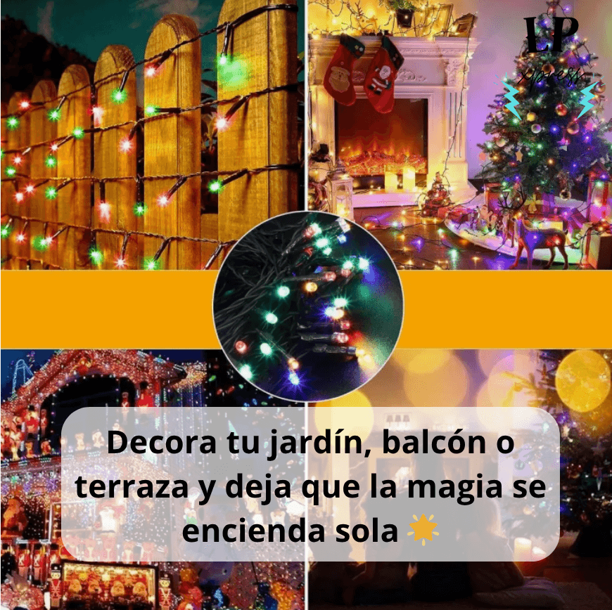 Luces Navideñas multicolor de 300 LED. ¡Transforma tu espacio exterior en un oasis luminoso! Disfruta de noches al aire libre llenas de encanto y calidez con 300 bombillas LED que funcionan con energía solar.