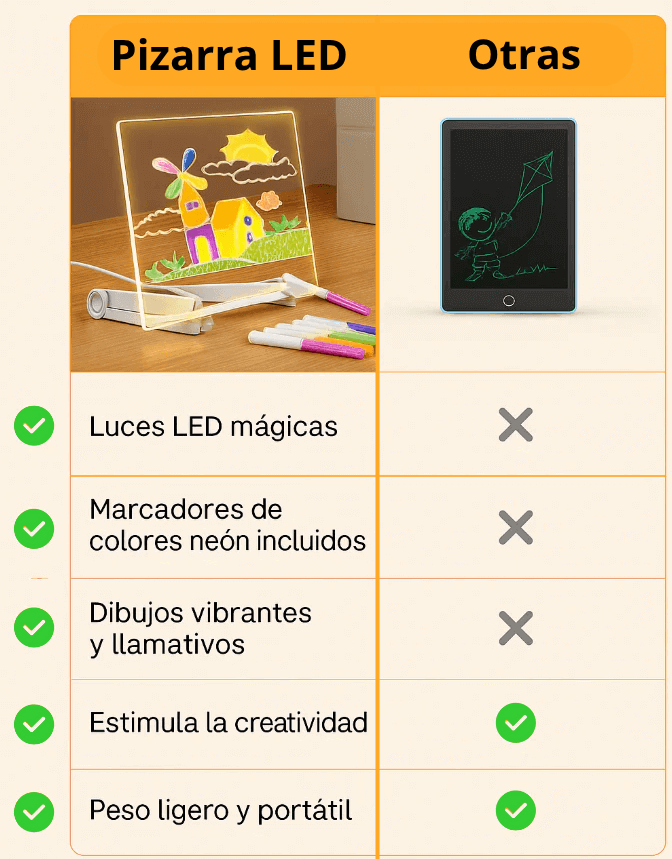Iluminación LED: Atrae la atención de niños y adultos por igual. Su luz brillante no solo realza tus dibujos y notas, sino que también estimula la creatividad, permitiendo que tus hijos se alejen de las pantallas y exploren su imaginación. 💡🎨